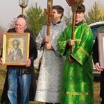 Приглашенное духовенство протоиерей Сергий Заякин и иерей Роман Щедров во главе с благочинным протоиереем Алексием Безукладниковым совершили молебен и освятили новосооруженный Крест. Также помянули заупокойной литией «зде погребенных», в том числе и местного священника Евгения и окропили святой водой всех молящихся.
